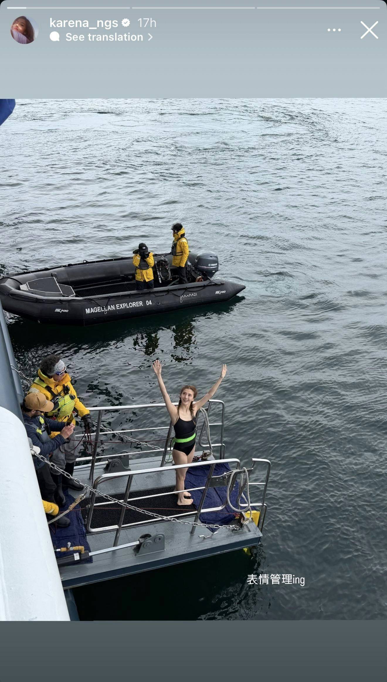 虽然吴千语在动态中幽默调侃“表情管理失败”,但照片中她高举双臂向船上同伴挥手的画面依然充满活力。连体泳衣勾勒出匀称身材,与身后壮观的冰山景象形成鲜明对比。尽管隔着屏幕都能感受到寒意,她却显得兴致高昂,配文用“爽”字表达激动心情。