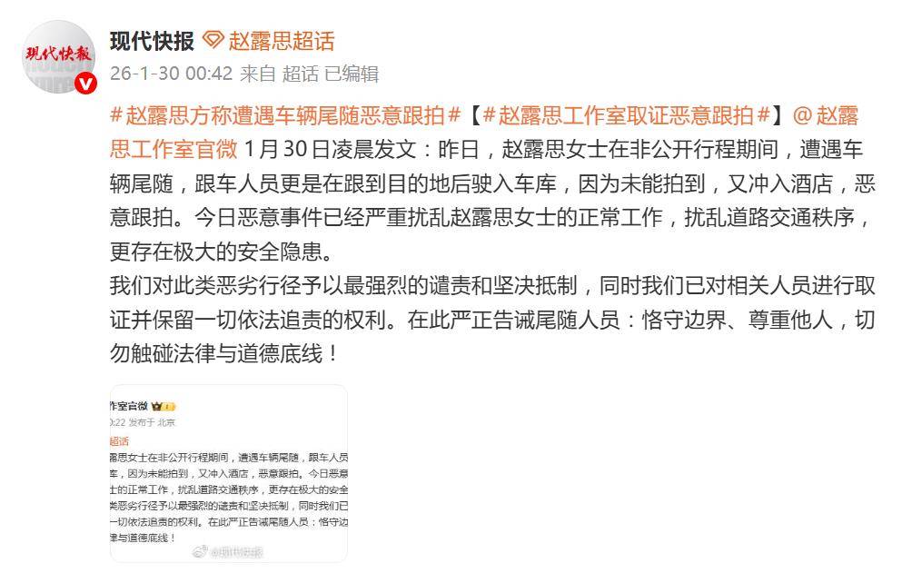 一则凌晨发布的声明,瞬间点燃了网友对“疯狂代拍”的怒火。1月30日凌晨,赵露思工作室紧急发文,严厉控诉赵露思在非公开行程中遭遇车辆尾随、恶意跟拍的恶劣行径,措辞