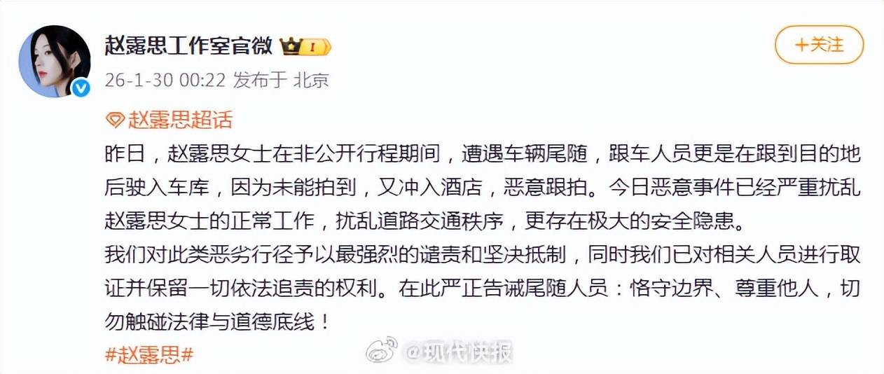 一则凌晨发布的声明,瞬间点燃了网友对“疯狂代拍”的怒火。1月30日凌晨,赵露思工作室紧急发文,严厉控诉赵露思在非公开行程中遭遇车辆尾随、恶意跟拍的恶劣行径,措辞之强烈,直接将这一乱象推上了风口浪尖。
