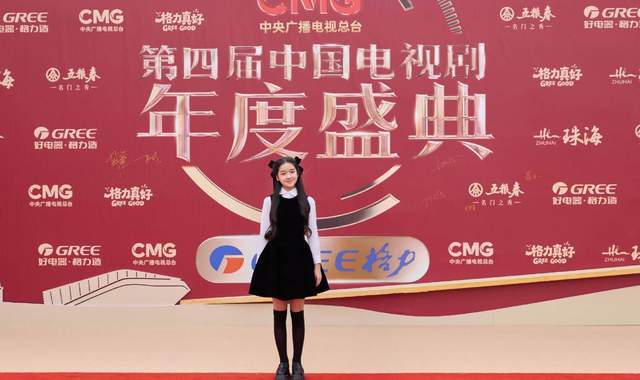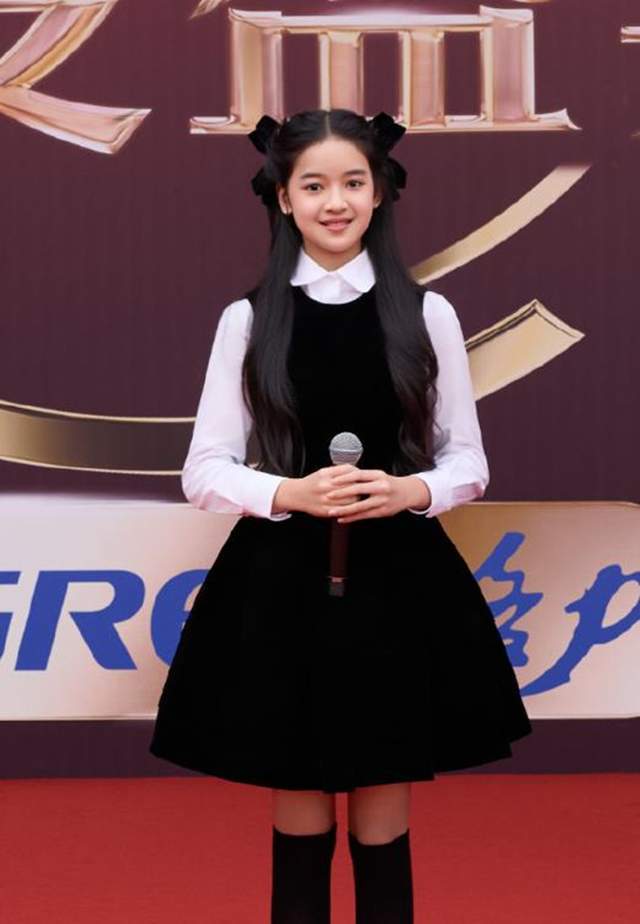 外穿一件黑色无袖连衣裙内搭白色立领长袖衬衫现身红毯的天天,整体造型简洁大方,兼具童真与时尚感,非常适合这种正式的场合。面对镜头的天天笑容甜美,表现自信大方。