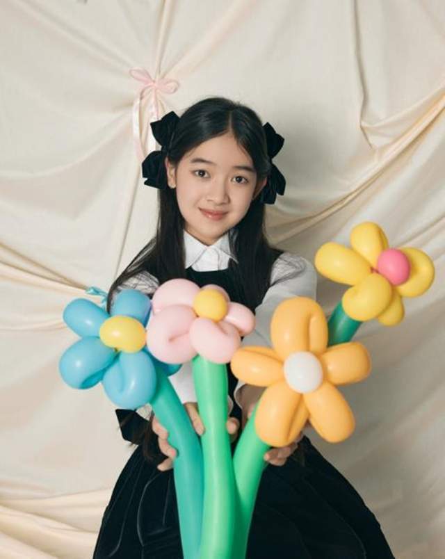 下图中,手捧气球花拍照的天天,看向镜头的她笑容甜美,一双眼睛明亮有神,一看就是个很有灵气的小姑娘。