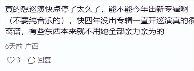 对比圈内的其他歌手,没一个像她这么频繁开演唱会的,其他歌手就算战线拖得比较长,也会稍微控制一下次数,只有她是几乎频繁开遍了各个城市。