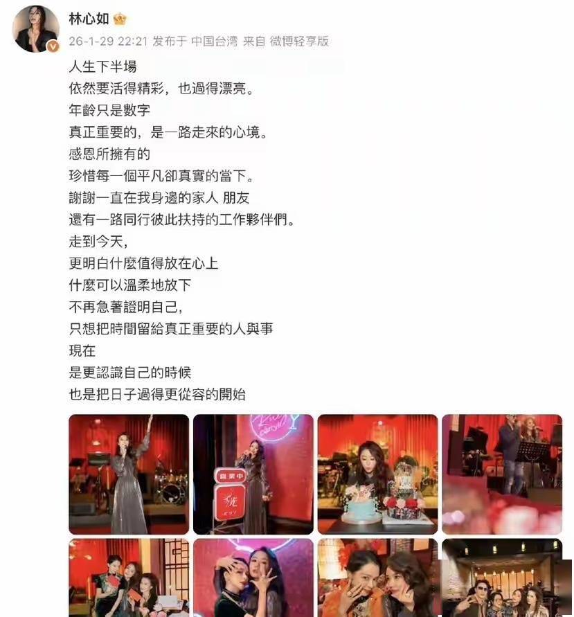 林心如在50岁生日时,也发表了自己的生日感言,她感慨到了一些事情,年龄只是数字,重要的是平凡且真实的当下,她的感慨很真诚,也是她这个年龄的人生感悟。