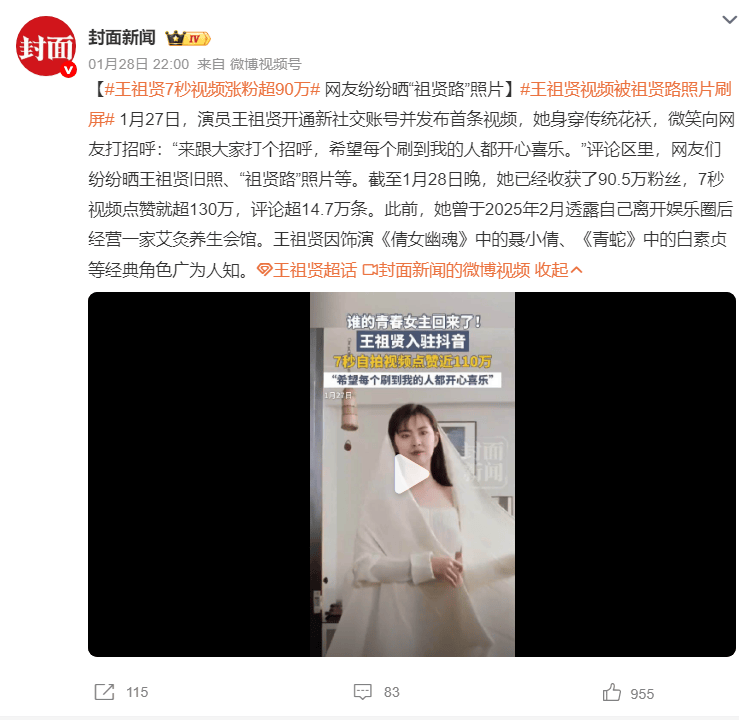 1月27日,演员王祖贤开通新社交账号并发布首条视频,她身穿传统花袄,微笑向网友打招呼:“来跟大家打个招呼,希望每个刷到我的人都开心喜乐。”评论区里,网友们纷纷晒王祖贤旧照、“祖贤路”照片等。截至1月28日晚,她已经收获了90.5万粉丝,7秒视频点赞就超130万,评论超14.7万条。此前,她曾于2025年2月透露自己离开娱乐圈后经营一家艾灸养生会馆。王祖贤因饰演《倩女幽魂》中的聂小倩、《青蛇》中的白素贞等经典角色广为人知。