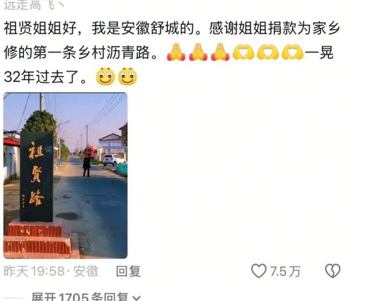 然而,此次“炸场”引发的最大波澜,并非仅仅源于情怀。视频评论区,一条来自安徽舒城网友的留言被顶上首位,收获11.3万点赞:“王祖贤姐姐好,我是安徽舒城的,感谢姐姐捐款为家乡修的第一条乡村沥青路。一晃32年过去了。”随文附上的“祖贤路”路碑照片,如同一把钥匙,开启了尘封三十余载的往事。