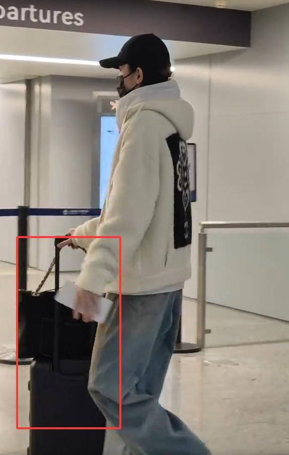 她的手上提着不少东西,一只手拖着一个银色的行李箱,上面放着一个大大的黑色手提袋看起来沉甸甸的。