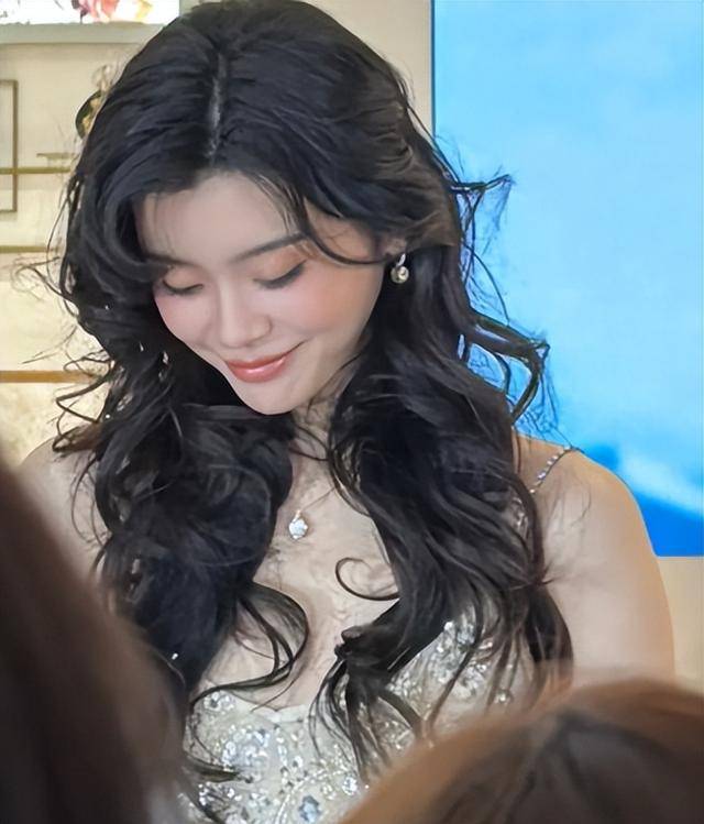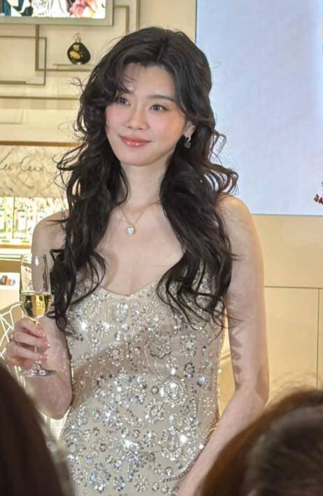 前阵子的活动上,她穿了一件香槟色的贴身吊带裙,港风大波浪打理得一丝不苟,妆容清透精致,底妆服帖到看不出毛孔。
