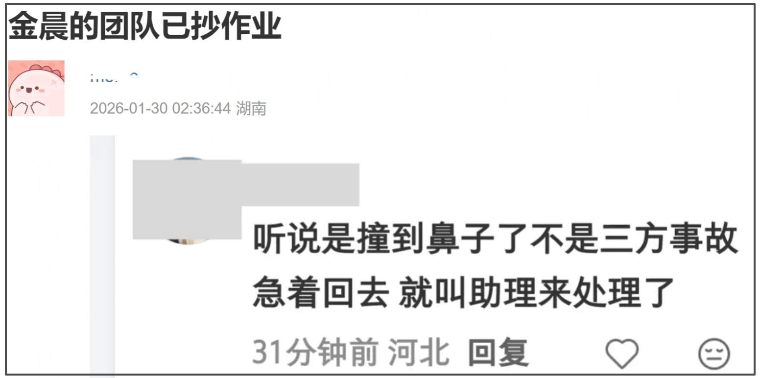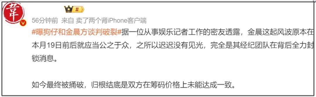 有业内爆料金晨的事件原本在1月中旬就该曝光,但经纪团队一直在后面公关,只不过双方最终在价格上没能达成一致。