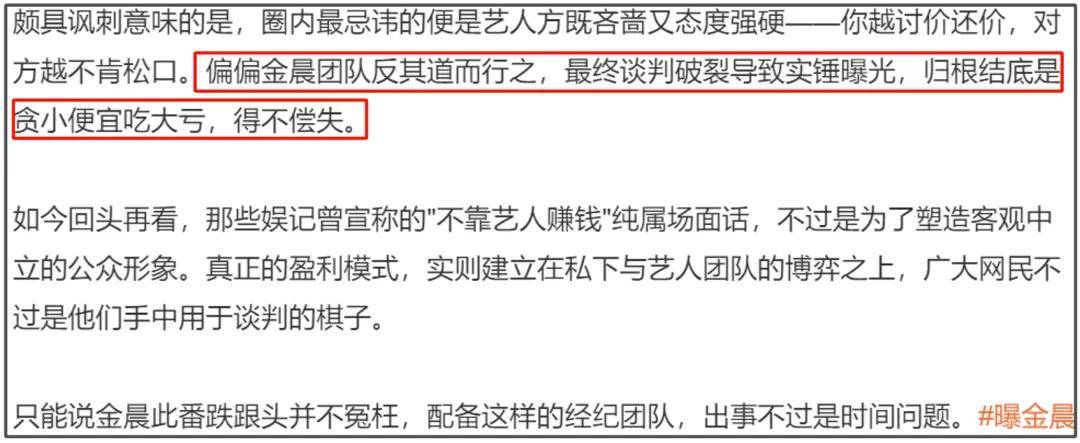 知情人爆料称圈内最忌艺人吝啬还态度不好,讨价还价。偏偏金晨团队就是这样,最终谈判破裂,“贪小便宜吃大亏”。