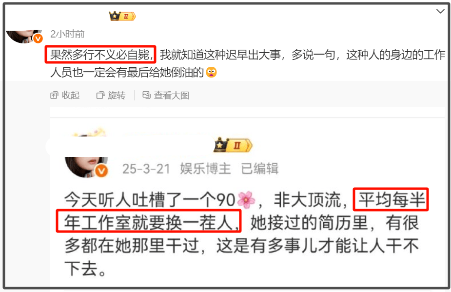 业内称某90花平均每半年,工作室就要换一茬人,业内直言“这是有多事儿才能让人干不下去”。金晨被曝肇事逃逸之后,该业内再度发文称,“多行不义必自毙”,就差点名金晨了。
