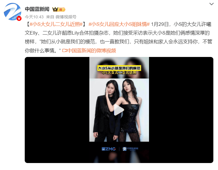 1月29日,小S的大女儿许曦文Elly、二女儿许韶恩Lily合体拍摄杂志,她们接受采访表示大小S是她们俩感情深厚的榜样,“她们从小就是我们的模范,也一直教我们,只有姐妹和家人会永远支持你,不管你做什么事情。”