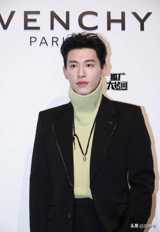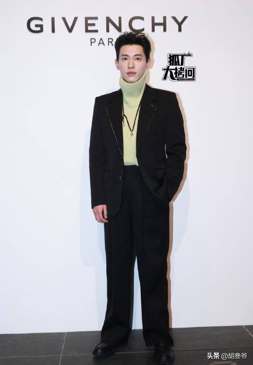 别人都想着露肤显身材,争着比谁的裙子更短、谁的领口更低,他倒好,一身全黑造型,浅绿色高领毛衣打底,外面套着黑色西装,全身上下没露一点皮肤。