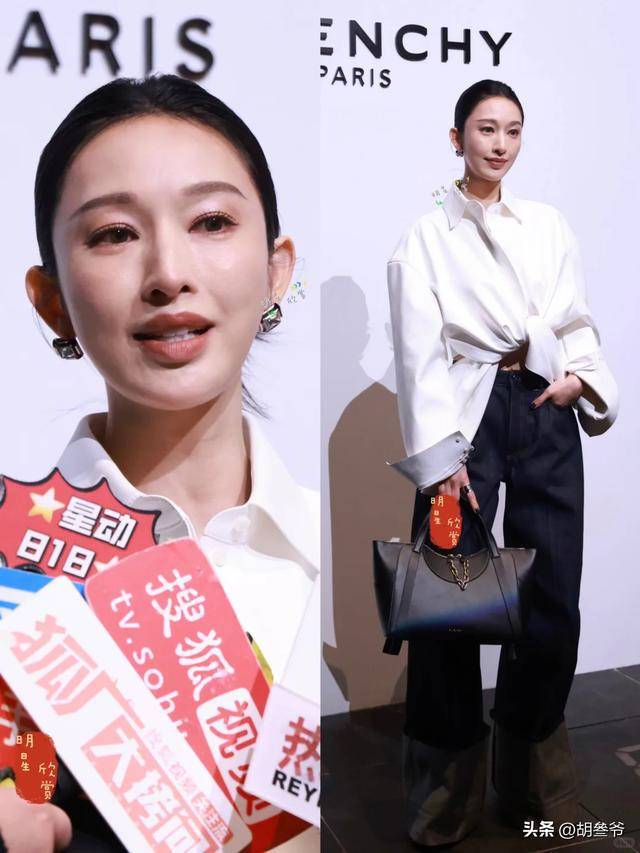 她选了一件宽松白衬衫搭配黑色长裤,走的是干练利落的路线,站在一众穿礼服的明星中间,反倒有种 “万花丛中一点绿” 的独特感。