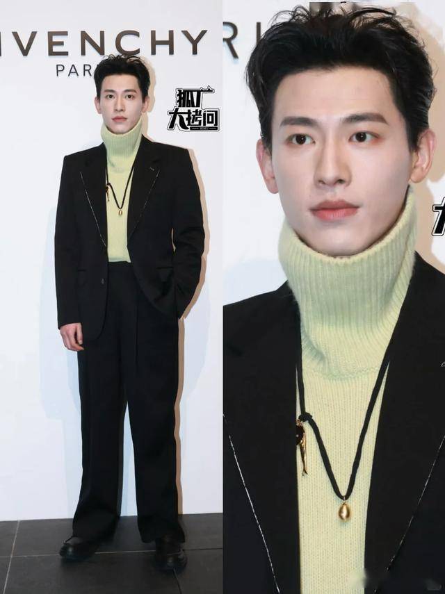别人都想着露肤显身材,争着比谁的裙子更短、谁的领口更低,他倒好,一身全黑造型,浅绿色高领毛衣打底,外面套着黑色西装,全身上下没露一点皮肤。