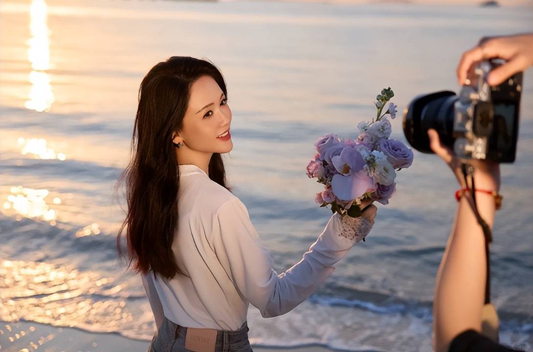 另一组照片里,她穿着白色上衣搭配牛仔裤,手捧鲜花,线条纤细,腰身明显,少女感直接拉满。