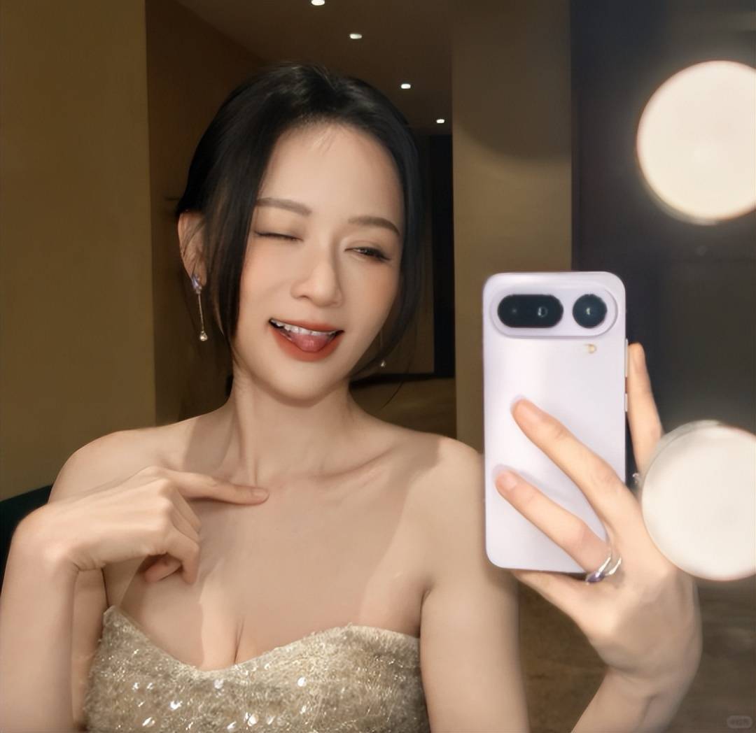 这次她穿的是一条金色裹胸裙,造型简约却很考验身材。她举着手机自拍,还俏皮吐舌,整个人状态轻松又灵动。
