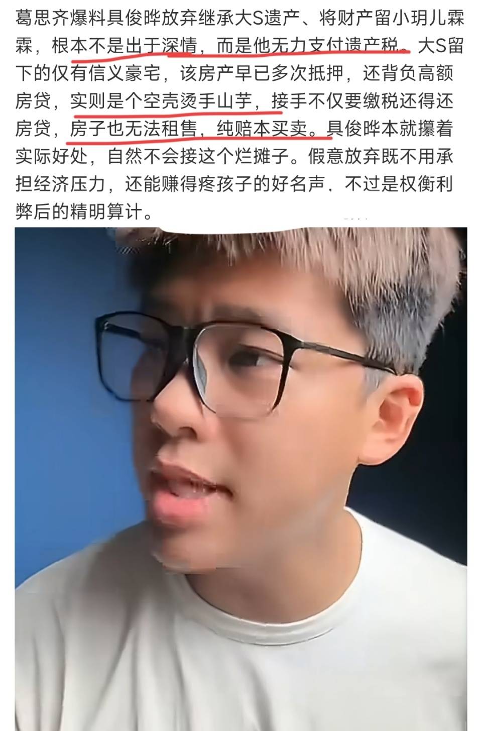 娱记葛斯齐揭秘具俊晔把大S遗产转给2个孩子,就是因为他没有钱还房贷,交不起遗产税——引言。