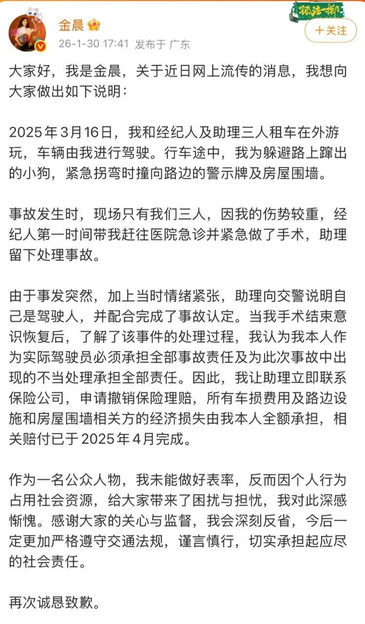 1月30日下午,金晨就交通事故涉嫌“顶包”一事做出了回应并说明了情况。