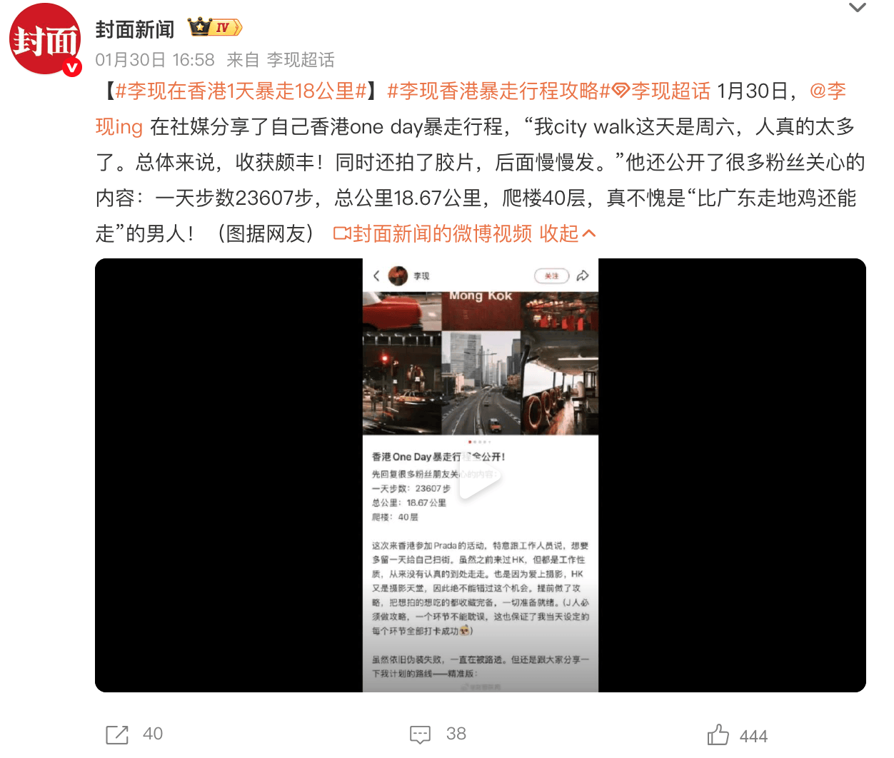 搜狐娱乐讯 1月30日,李现在社媒分享了自己香港one day暴走行程,“我city walk这天是周六,人真的太多了。总体来说,收获颇丰!同时还拍了胶片,后面慢慢发。”他还公开了很多粉丝关心的内容:一天步数23607步,总公里18.67公里,爬楼40层。
