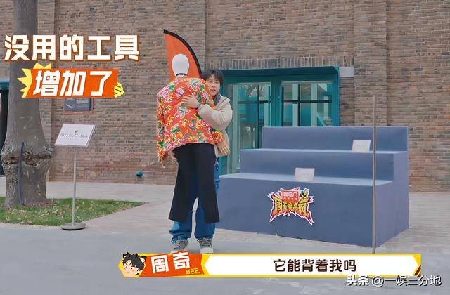 周奇作为最后到来的嘉宾,需要抱着假人行走,也是比较考验脸皮的道具。