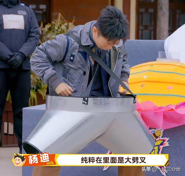 相比之下,第一个出场的杨迪就很惨了,穿着一个铁裤衩,几乎要靠“螃蟹步”走到目的地。