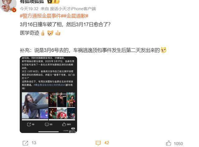 这也成了网友眼中的一大槽点,觉得按照她的解释,她刚撞车时伤的严重,到了不能自己处理车祸的地步,那车祸后才过十几天,怎么脸就恢复了?