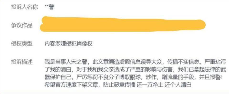 直到1月30日,宋之馨终于憋不住了 —— 但她没按常理出牌发声明,而是直接把报道此事的自媒体给投诉了。
