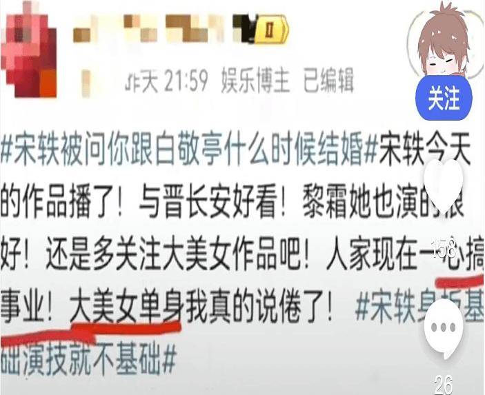 而且去年年底,宋轶的新剧《与晋长安》热播阶段,还开始强调自己的“大女主”人设,且每次接受采访时发起的话题都是自由、独立等,甚至还在综艺中自称是“单身联盟成员”,态度鲜明。