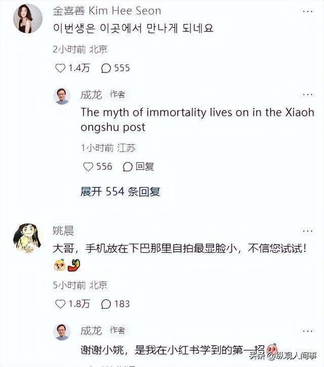 姚晨几乎是秒评:“大哥,手机放下巴那里自拍最显脸小,不信您试试!” 成龙回复得超快,还带了个笑脸表情:“谢谢小姚,这是我在小红书学到的第一招,回头就试试。”