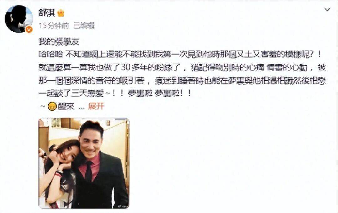 30日,舒淇在社交平台发长文分享自己与偶像张学友之间的缘分,透露自己做了张学友30多年的粉丝。她回忆,从1997年刚到香港时,在经理人林隽的安排下于生日当天观看了张学友音乐剧《雪狼湖》的演出,令她激动不已。此后,她受邀出演张学友演唱会影片和MV,圆了少女时代的追星梦。