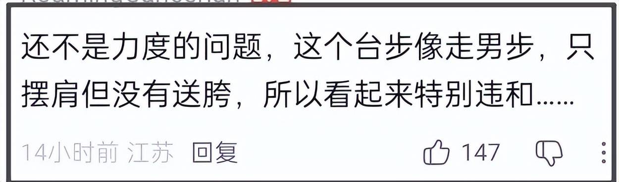 与之形成对比的则是走在她前面的模特,整个身姿飒爽干练,愈发显得刘雯的步伐没有力度,软绵绵的。有熟悉模特步的网友分析后表示刘雯的步伐跟力度没有太大关系,根本原因是她只摆动肩膀,没有送胯,所以身体僵硬,显得很违和。