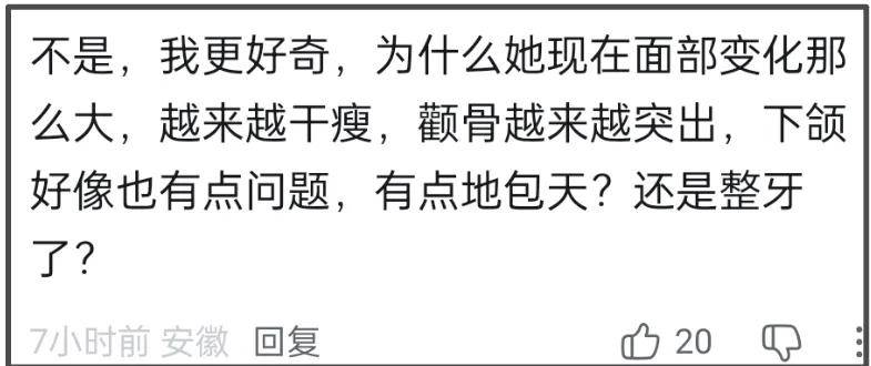 除了台步问题外,还有网友好奇她的面部变化,表示为什么会越来越干瘦,颧骨突出得也越来越夸张,下颌关节也看着不太正常,还有一些地包天。这一点在说话的时候格外明显,看起来面相都变了。