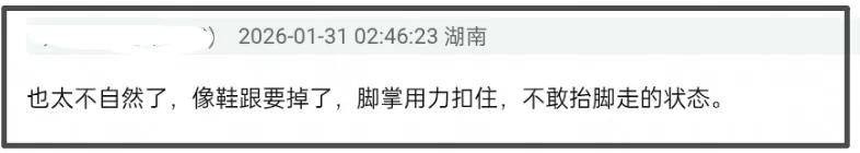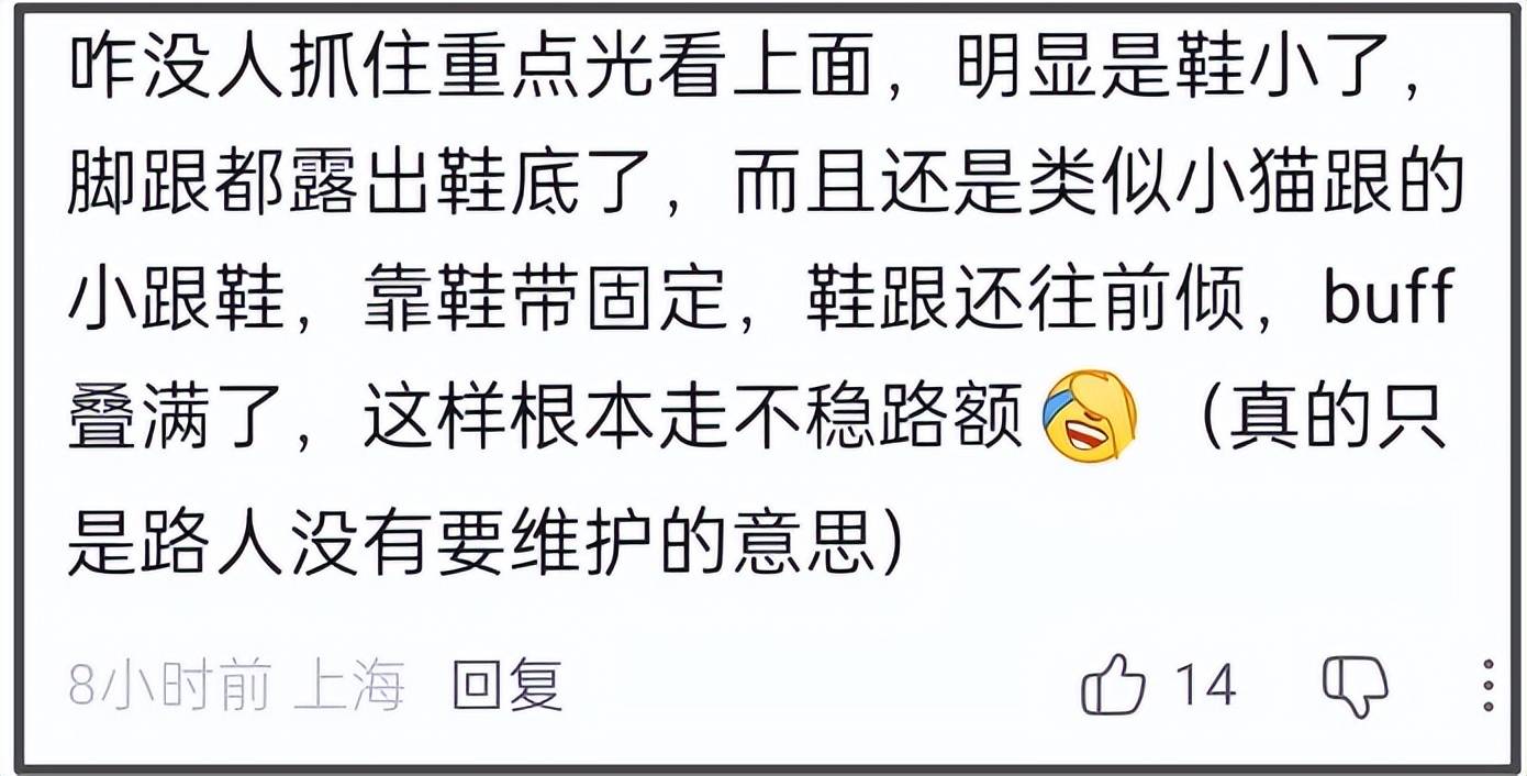 针对这个情况,有网友表示可能是鞋子不合脚,不是鞋小就是鞋跟不稳,需要脚掌用力扣住鞋子,才导致不敢抬脚走路。从刘雯的脚背来看,这双鞋子确实没那么跟脚,踮脚走的时候脚背肉挤到一起,脚后跟在鞋子外面。但是刘雯作为一个专业模特,应当有能力处理鞋子不合脚等突发情况,而不是像一个业余人士一样散漫,被吐槽消极怠工不冤枉。