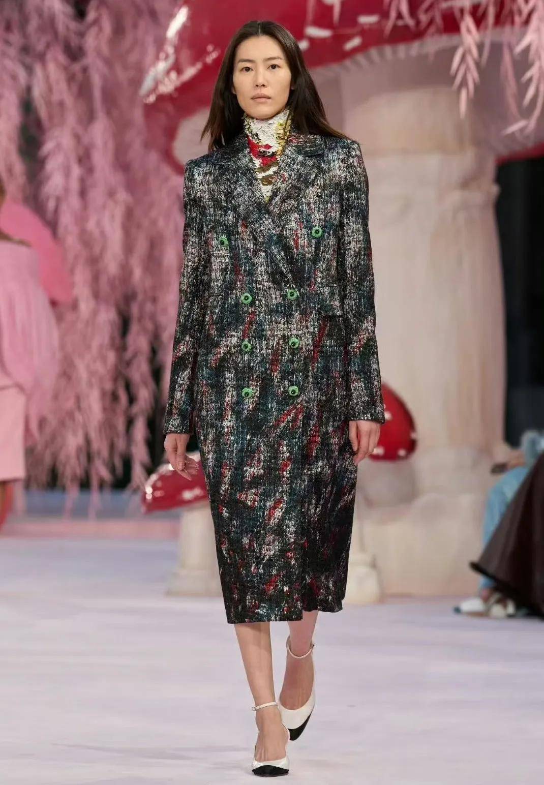 看刘雯的台步,会发现她整个人无精打采,有气无力,像机器人。走动的时候身体似乎无法保持平衡,肩膀东摇西晃,十分散漫,因此有网友嘲讽她像“阿姨逛菜市场”一样自由。