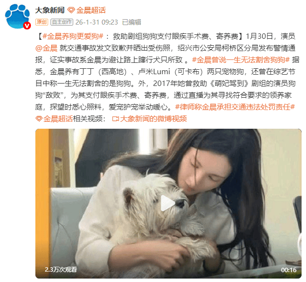 据悉,金晨养有丁丁(西高地)、卢米Lumi(可卡布)两只宠物狗,还曾在综艺节目中称一生无法割舍的是狗狗。此外,2017年她曾救助《萌妃驾到》剧组的演员狗狗“敌败”,为其支付眼疾手术费、寄养费,通过直播为其寻找符合要求的领养家庭,探望时悉心照料,爱宠护宠举动暖心。