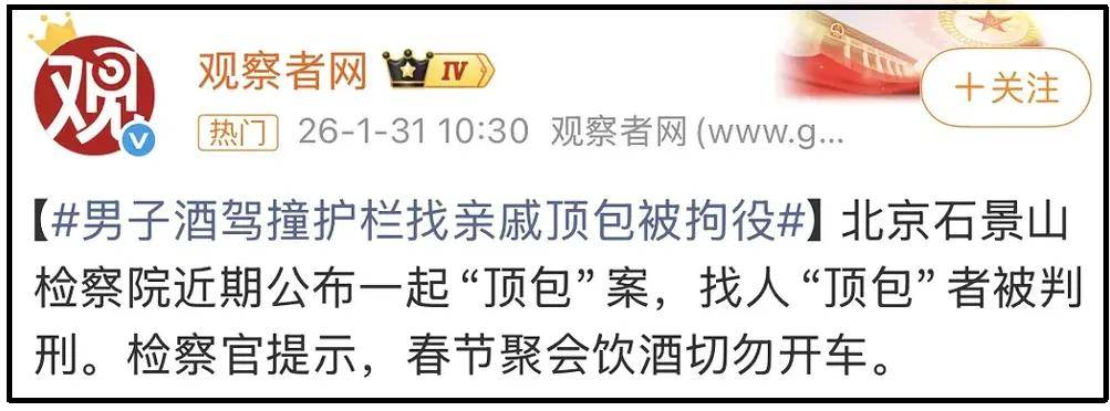 观察者网也报道了一则案例,某男子酒驾撞护栏找亲戚顶包被拘役。