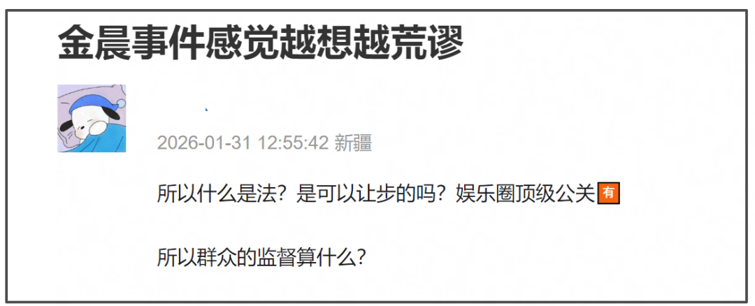 虽然金晨对事故做出了回应,但显然无法服众,网友还会持续监督,后续涉及对金晨等人的处罚问题,也需要对群众公布,金晨本人或许也需要进一步解释清楚。另外,娱乐圈虽然充斥着资本,但明星没有特权,试图对群众骑脸输出,影响只会更恶劣!