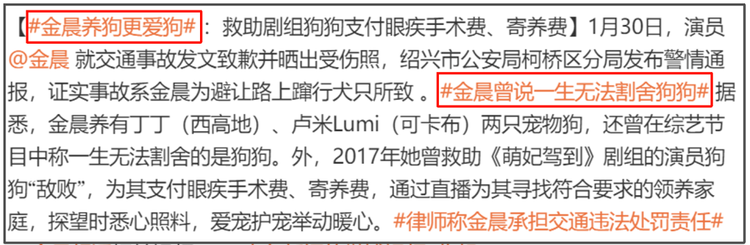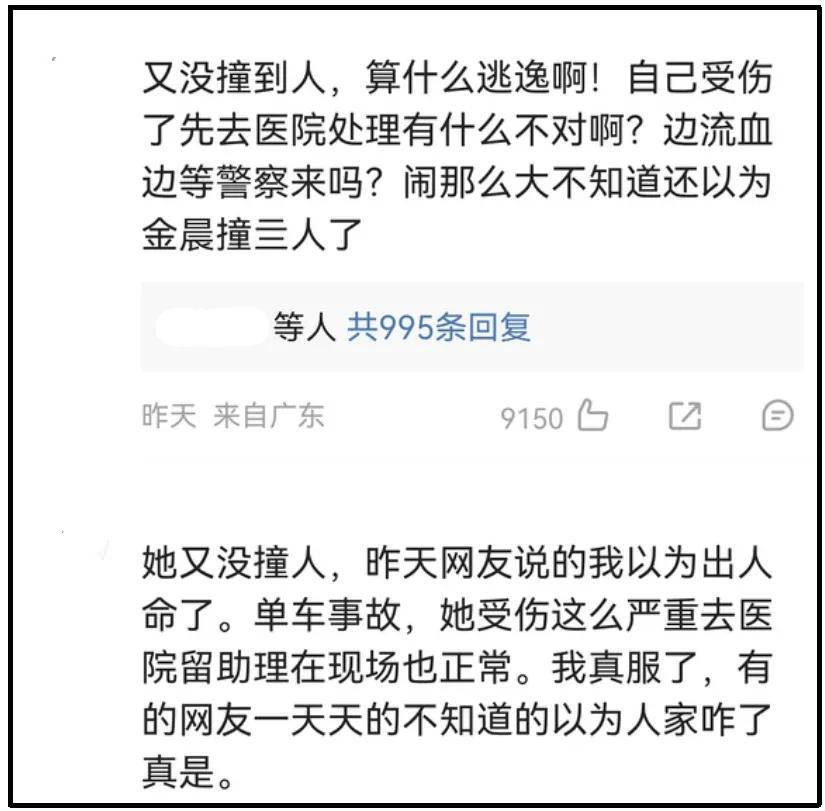 甚至还疑似出现大量水军洗白,说金晨一直爱护小动物,因为路上突然窜出小狗,金晨为了躲避才发生事故,“又没有撞到人”,“受伤了先去医院不算逃逸”。还有媒体配合发声,宣传金晨养狗更爱狗。