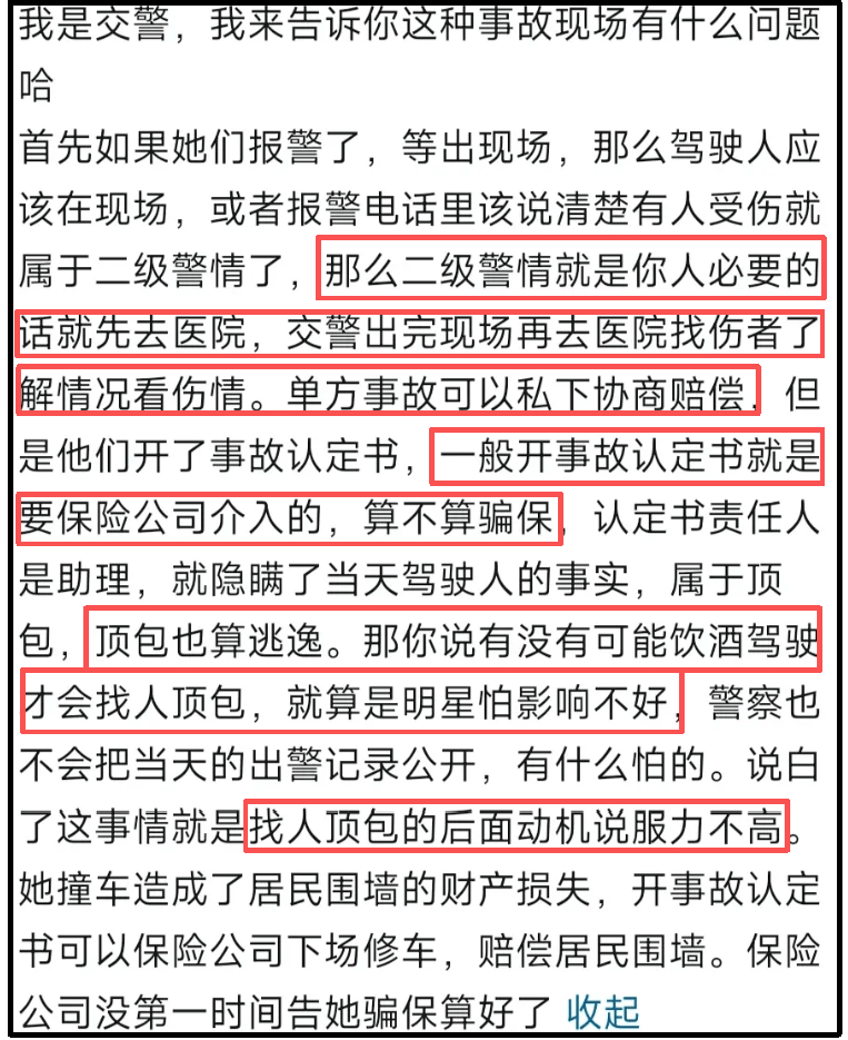已经有业内站出来针对金晨的事件展开普法讨论,这位业内不是别人,正是做过警察的前《奇葩说》选手。他直言金晨的行为构成交通事故后逃逸。金晨作为驾驶员和事故中的唯一责任人,在事故后十多个月,始终没有向警方投案,已经构成逃逸。