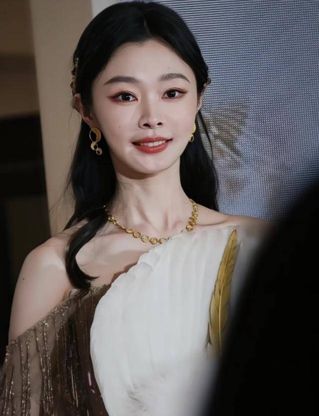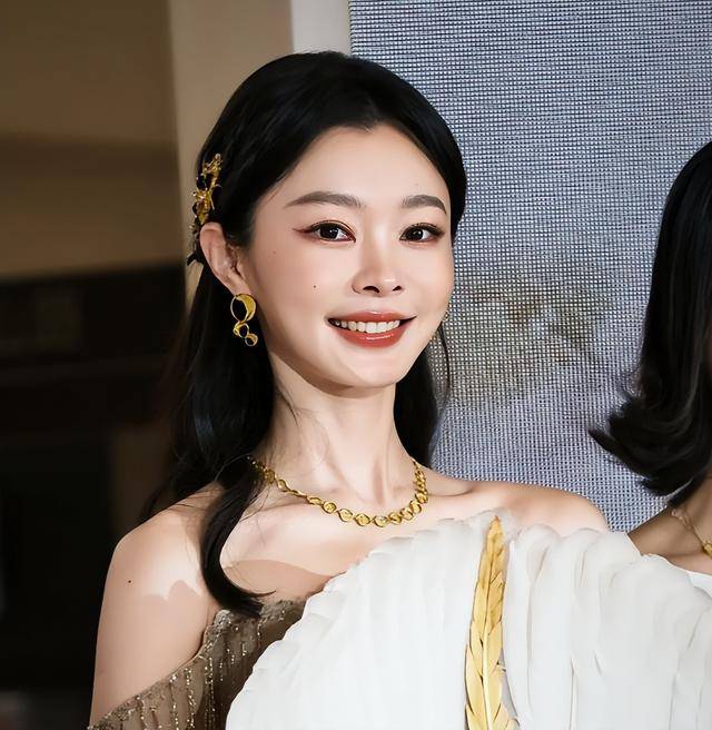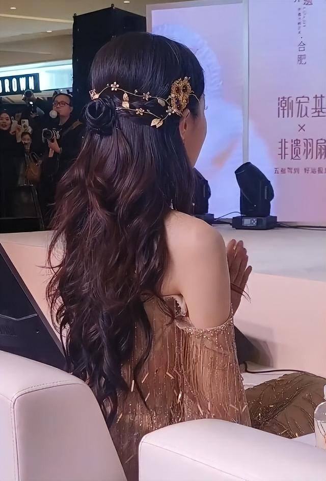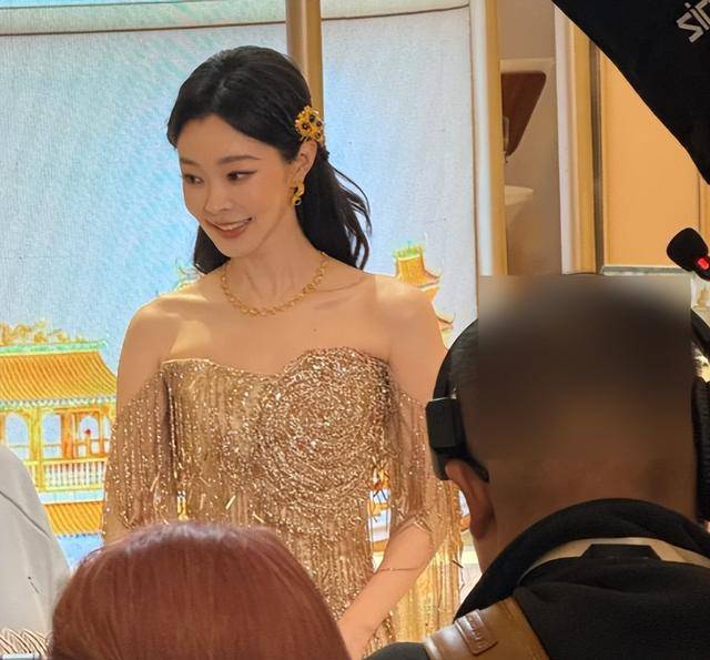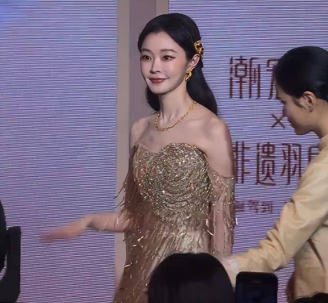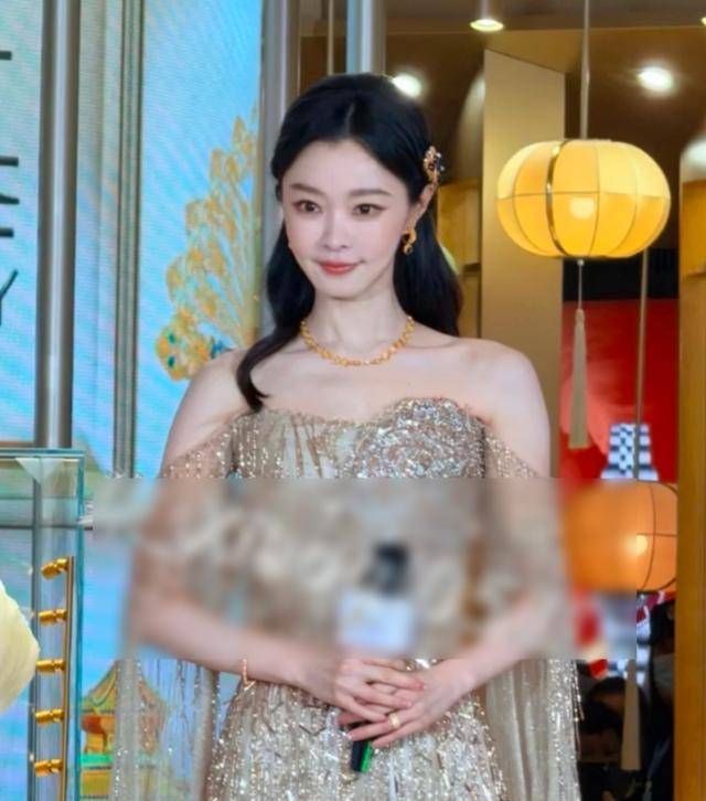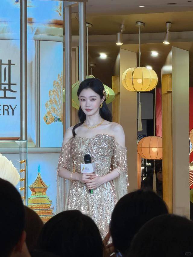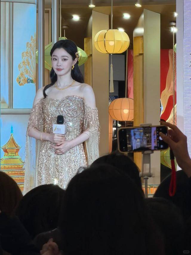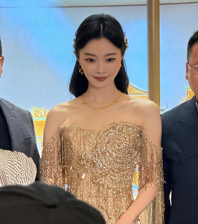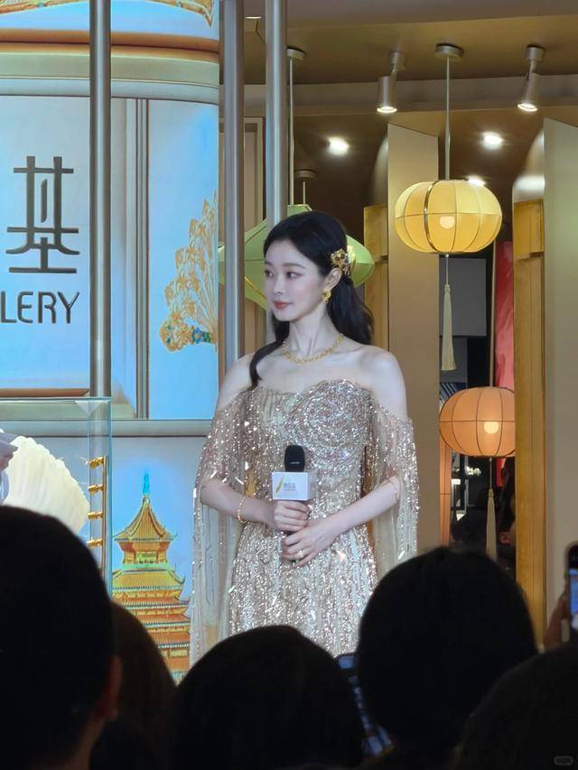 而她穿的这款金色裹胸长裙,其实是潮宏基定制款,裙摆上绣有细微的非遗花丝纹样,既贴合活动主题,又能凸显她的气质。
