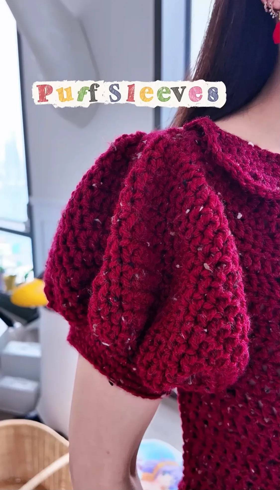 当镜头拉近后,就可以看到甘比红色钩织连体裤的肌理感。原来钩织连体裤也可以做到如此服帖,一点都不臃肿显胖。