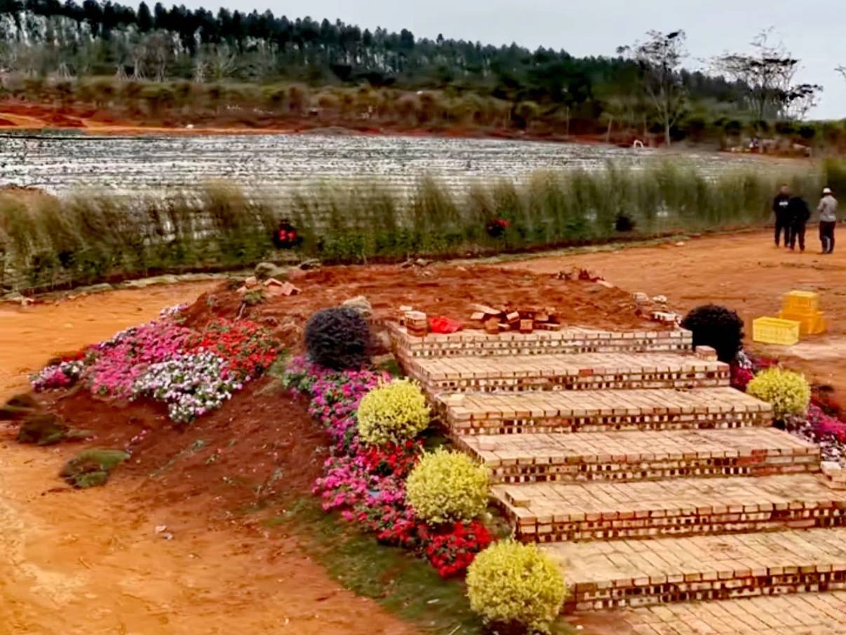 全红婵家的花园,其实并没有特意规划。就是在果园附近,有一处土丘。然后垫起来几层台阶,种上各种颜色的鲜花装饰。