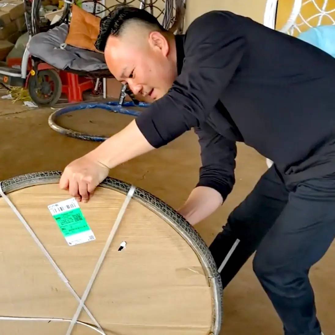 穿黑衣的就是老板乐哥。他和工人们一起把玻璃餐桌抬下来,并且亲自负责安装。乐哥承接了全红婵家别墅的智能门窗,经常宣传自己的产品。