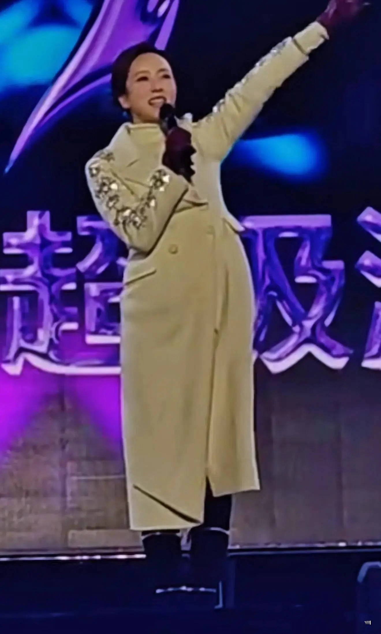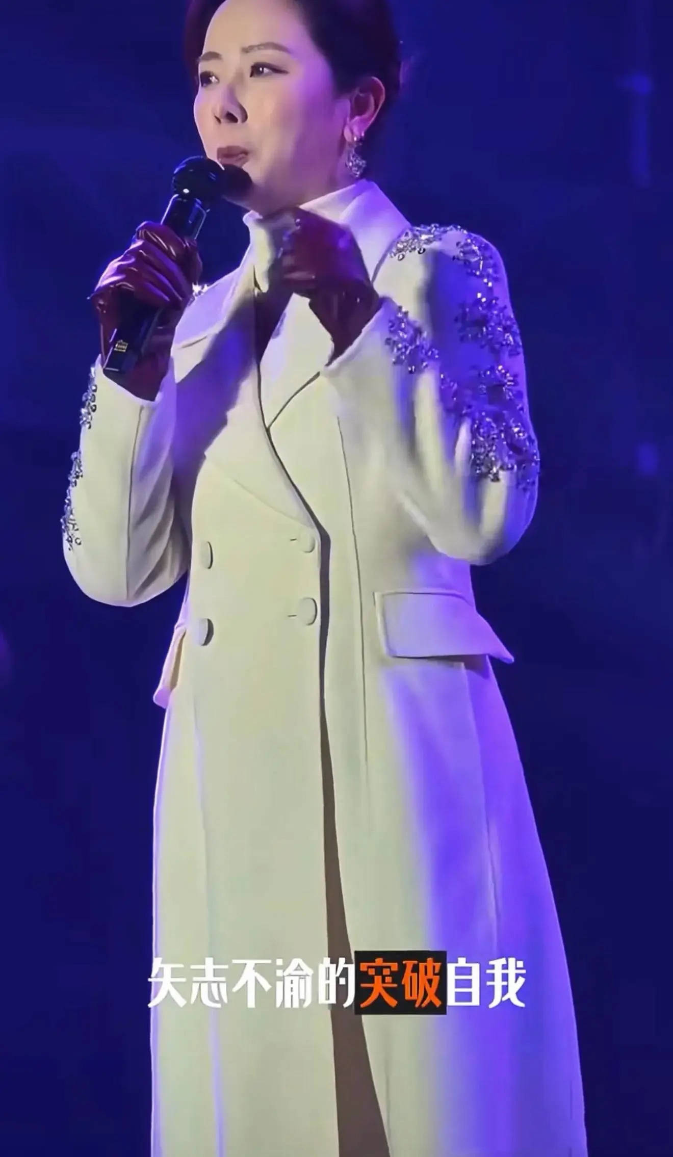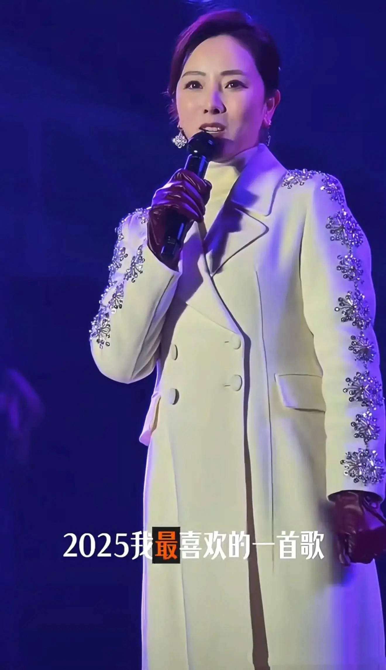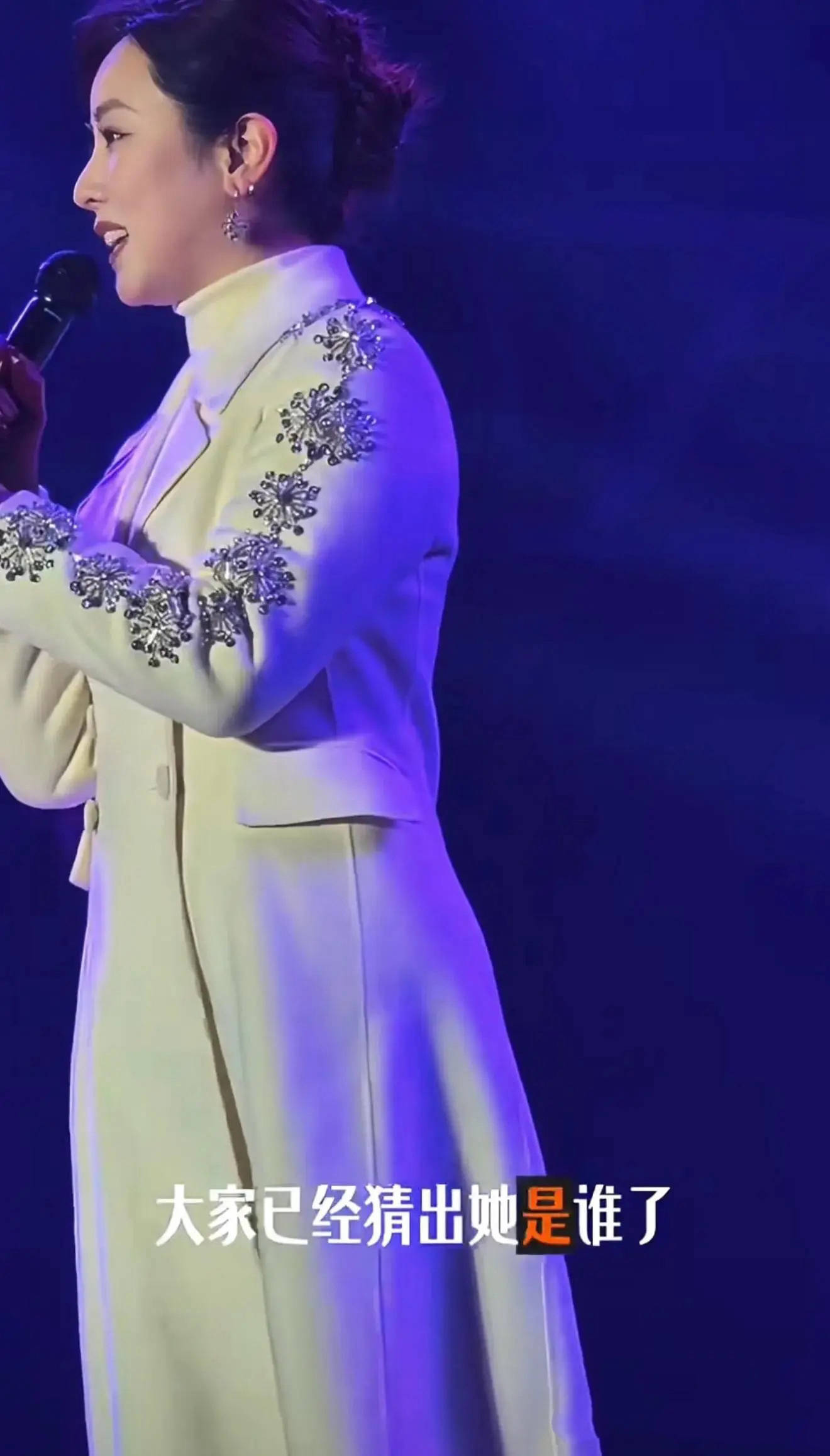 她穿的白色呢大衣,一看就是演出服。因为在手臂上有刺绣的装饰,这样的服装不够日常、给人的感觉也不很高级。