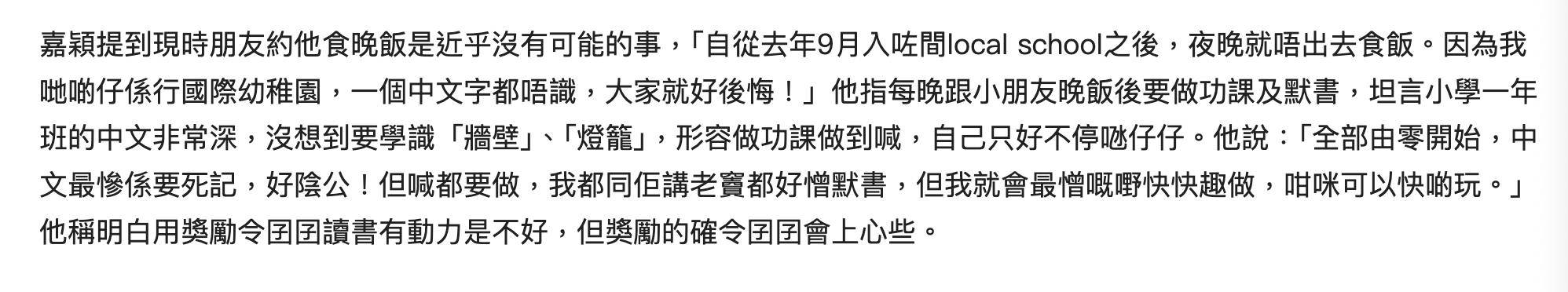 郑嘉颖自曝自从儿子在2025年9月就读了传统小学之后,自己晚间都很少外出吃饭,朋友都不敢约,因为每天晚上都要陪读,陪孩子做功课,要忙着帮孩子背书、默写,这令他“苦不堪言”。郑嘉颖称儿子在读小学之前,一个中文字都不会,因为儿子幼儿园读的是国际幼儿园,国际幼儿园根本不教中文,如今进入了传统学校的一年级,直接就上中文不说,而且一年级的中文还那么深。每天儿子做功课做到哭,但是哭也没办法,也要继续,自己就只能做陪读爸爸,夜夜陪着儿子读书。