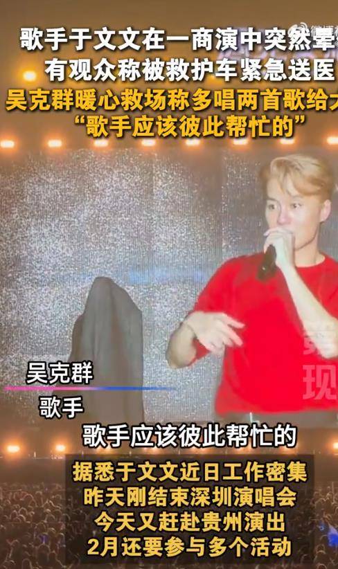 2月1日晚,歌手于文文在当地某商业演出中表演时突发身体不适,最终晕倒离场。同台演出的吴克群随即挺身而出,临时加唱两首歌曲稳住现场,一句“所有的歌手应该彼此帮忙”的朴实回应,在寒夜里漾开一片暖意。