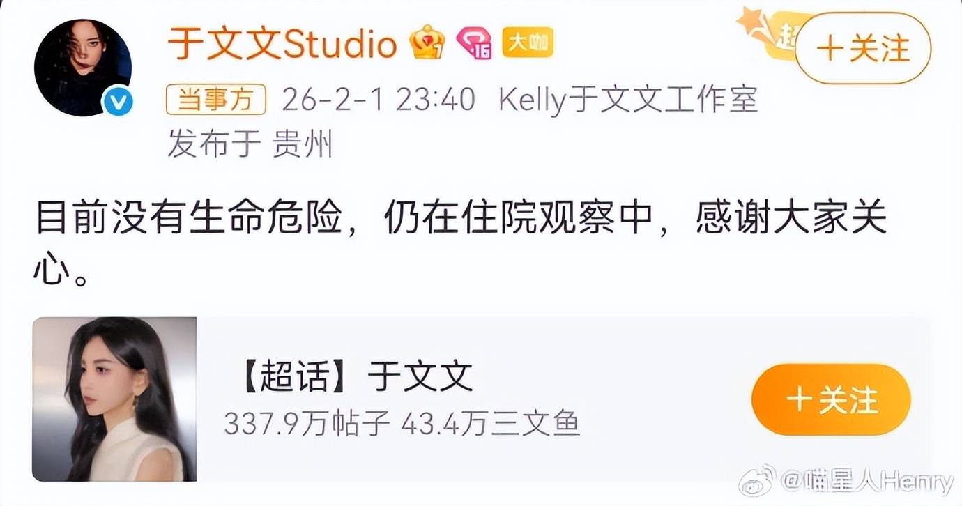 于文文工作室于当晚23时40分发布声明,向公众通报“目前没有生命危险,仍在住院观察中”,并对各界关心表示感谢。声明虽简短,却暂时平息了粉丝的担忧。回顾于文文近期行程,其工作强度可见一斑:她刚结束深圳演唱会,便于2月1日马不停蹄赶赴贵州演出,而工作室发布的行程显示,紧随其后的还有2日的广告拍摄、5日的北京颁奖盛典以及11日至13日的综艺录制。这位凭借《前任3:再见前任》插曲《体面》荣获华鼎奖、以演员与歌手双重身份活跃的艺人,其忙碌状态亦是行业高强度运转的一个切面。