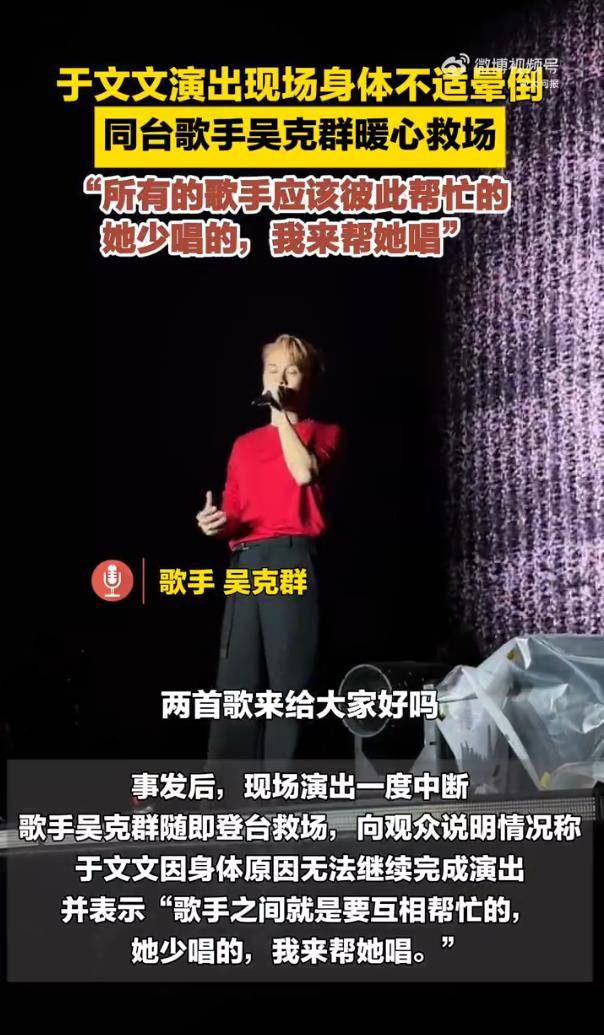 事发突然,演出一度中断,现场气氛凝重。关键时刻,同场演出的歌手吴克群主动登台。他没有回避意外,而是拿起话筒向观众清晰说明情况:“因为身体的原因,今天天气真的蛮冷的,所以(文文)刚才身体不适,没有办法把所有的歌都唱完。”紧接着,他的一句话掷地有声,温暖了寒夜:“但对我来说,所有的歌手应该彼此帮忙的,所以她少唱的,我来帮她唱。”