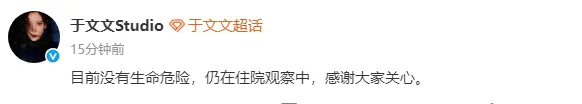 于文文工作室发文报平安:“目前没有生命危险,仍在住院观察中,感谢大家关心。”
