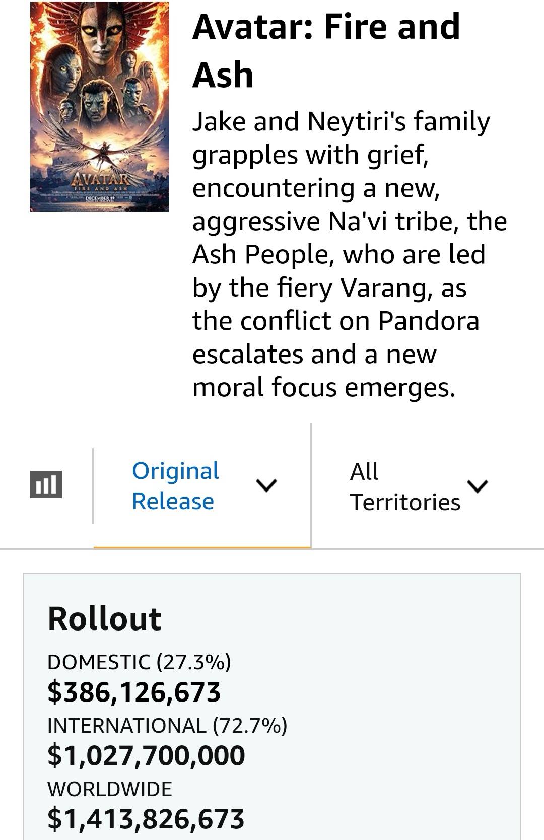 截止目前,《阿凡达3》北美票房3.86亿美元,海外票房10.28亿美元,全球票房14.14亿美元。其中,海外市场贡献了近73%的票房。《阿凡达》《阿凡达2》全球票房分别为29.24亿美元、23.